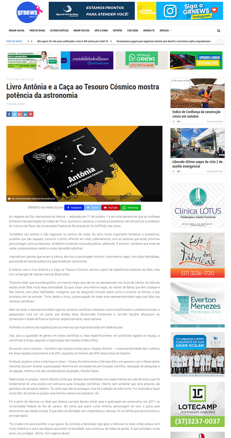 Portal GR News (Pará de Minas - MG) | MAST na reportagem "Livro 'Antonia e a Caça ao Tesouro Cósmico' mostra potência da astronomia"