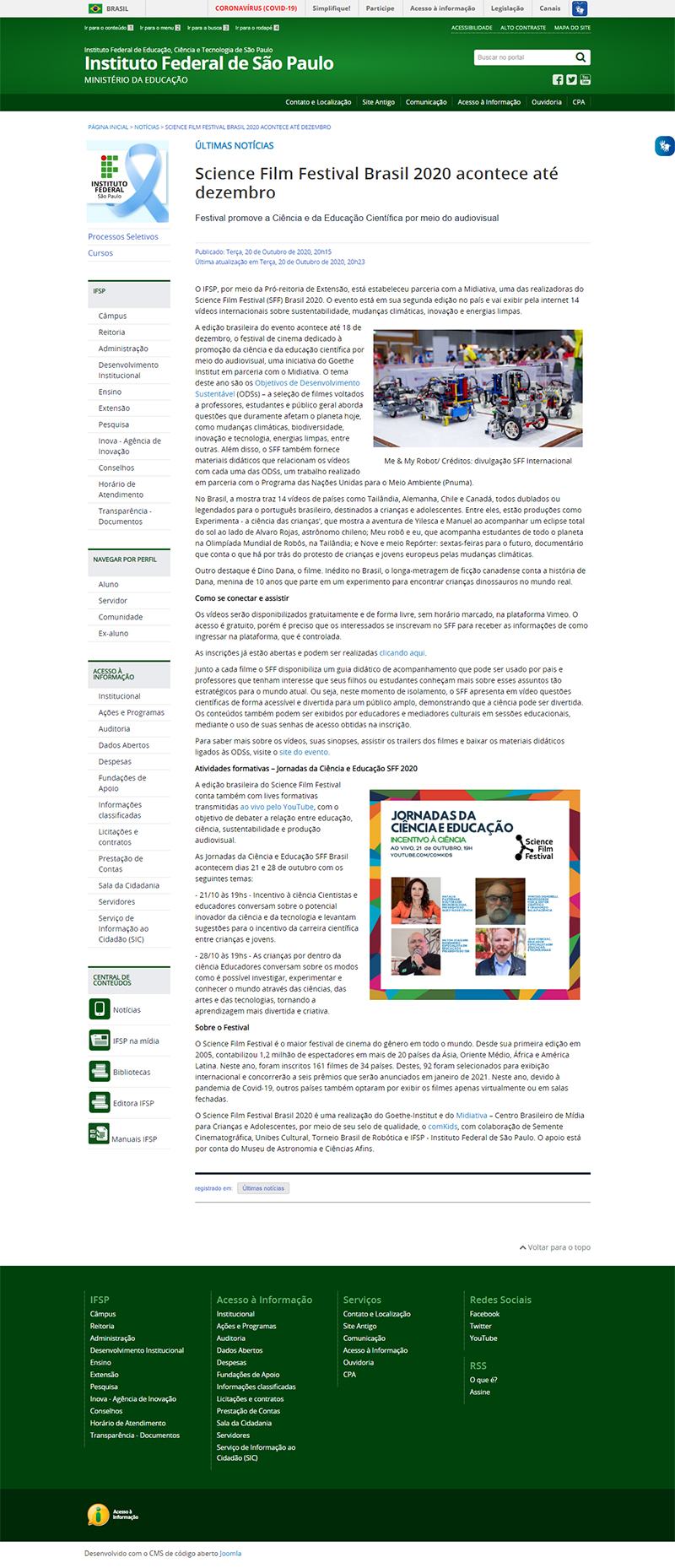 Portal IFSP (Instituto Federal de Educação, Ciência e Tecnologia de São Paulo) | MAST no Science Film Festival 2020
