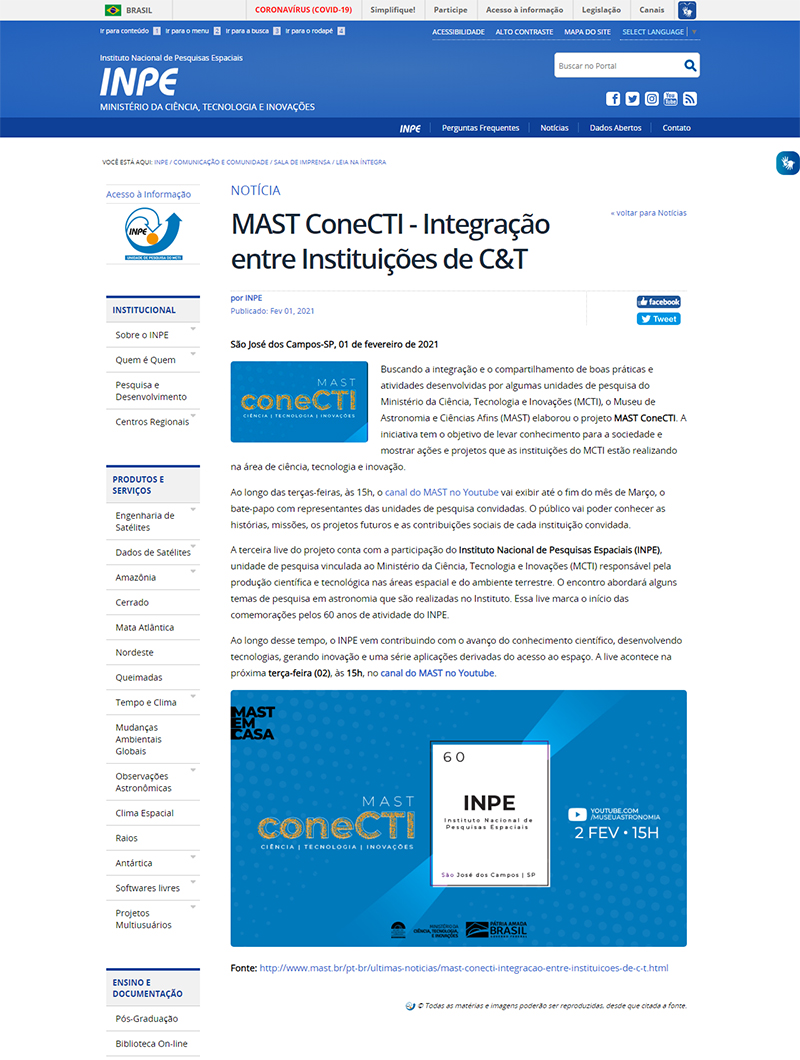 Portal INPE | Projeto MAST ConeCTI, integra unidades vinculadas do Ministério de Ciência, Tecnologia e Inovações