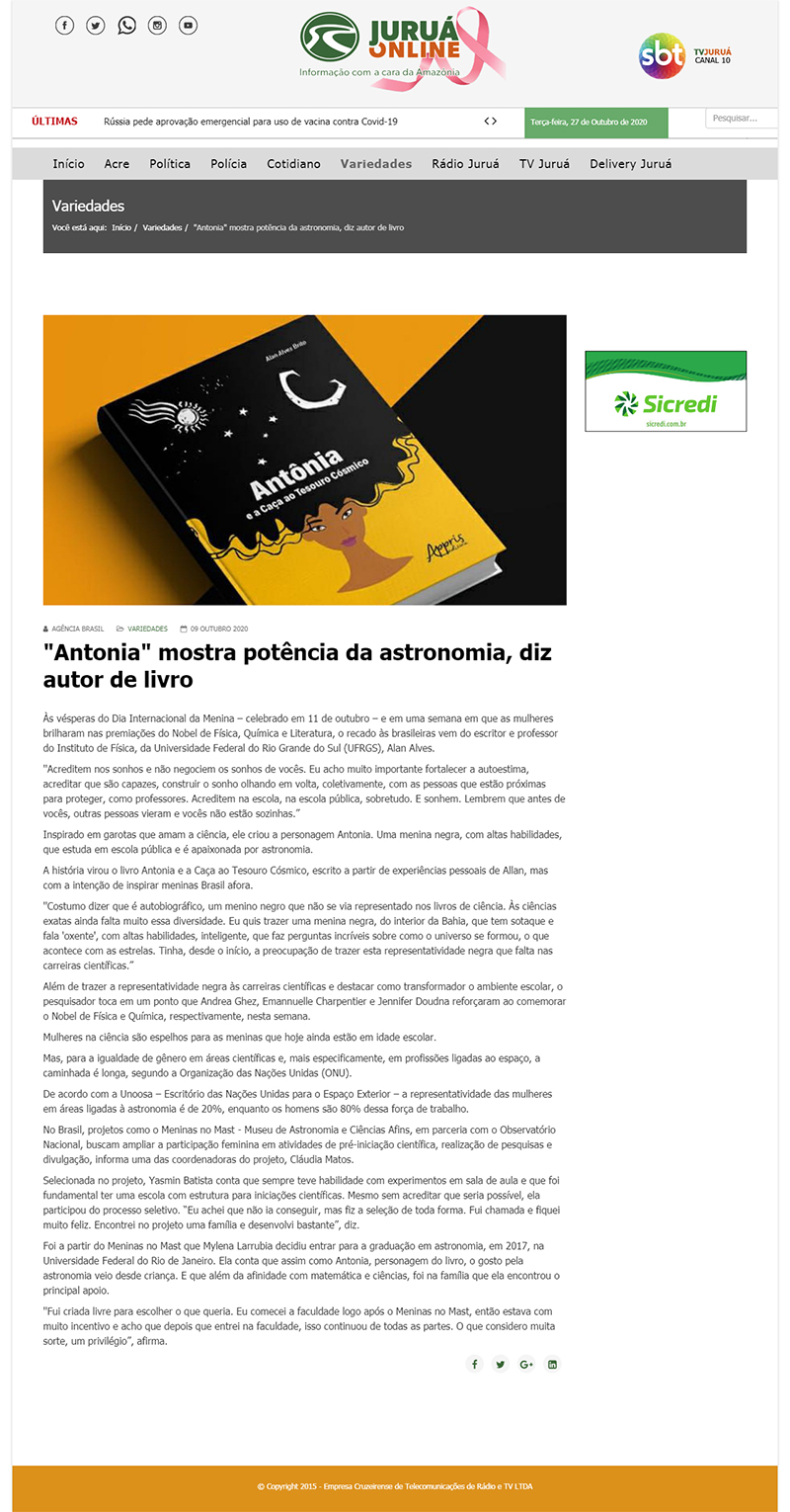 Portal Juruá On-line (Cruzeiro do Sul - AC) | MAST na reportagem "Livro 'Antonia e a Caça ao Tesouro Cósmico' mostra potência da astronomia"