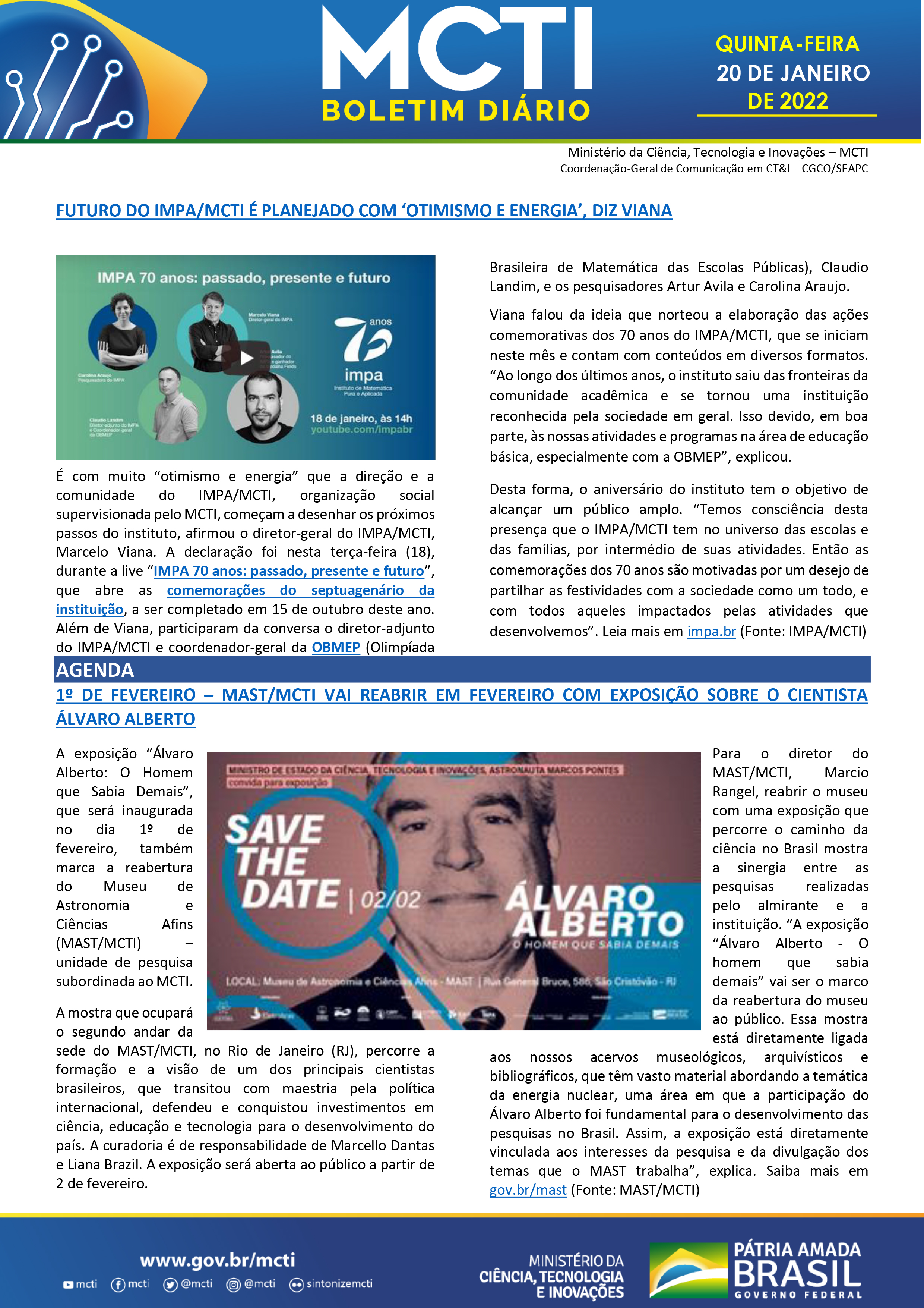 Portal MCTI / Boletim Diário / Agenda - MAST/MCTI vai reabrir em fevereiro com exposição sobre o cientista Álvaro Alberto