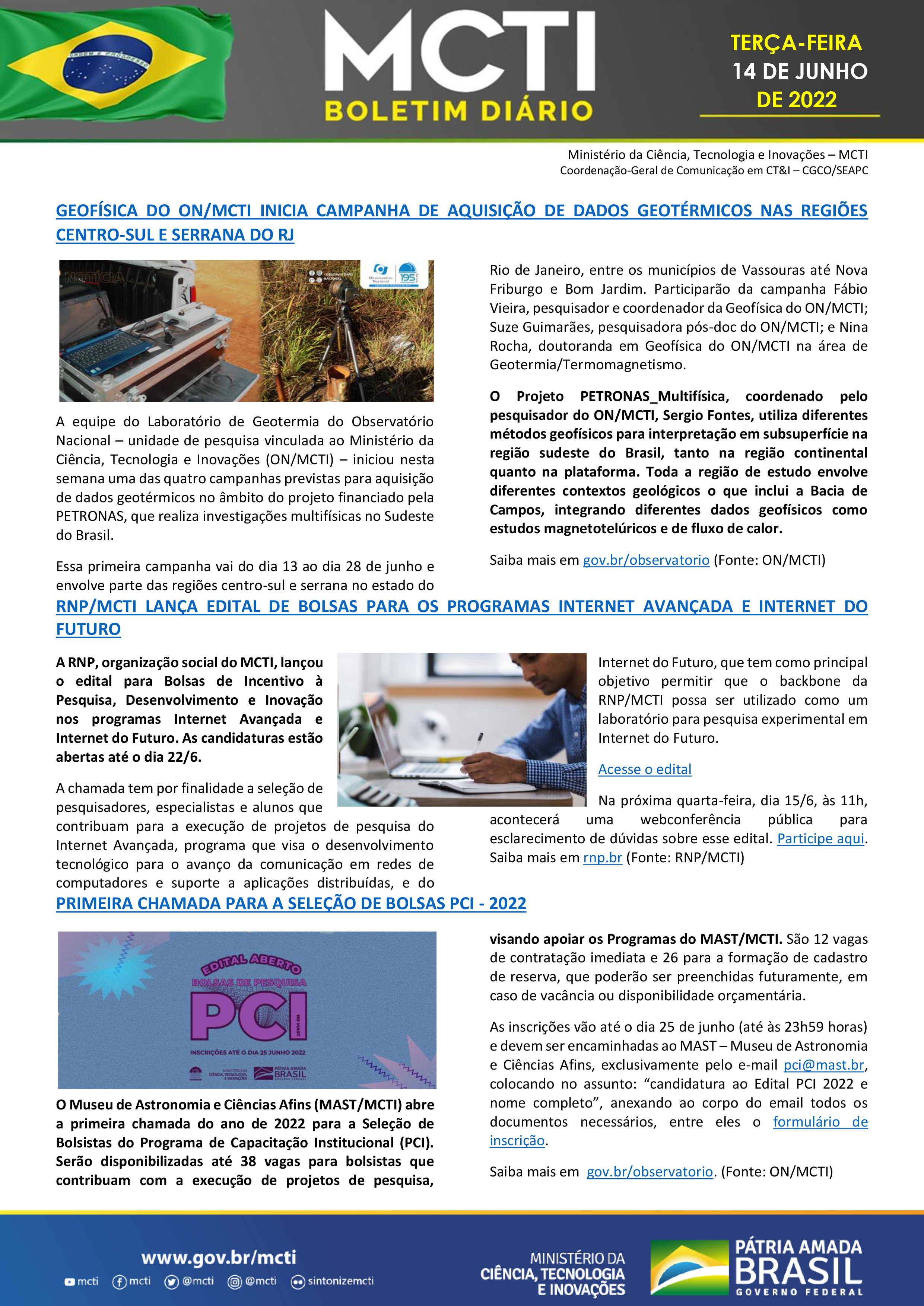 Portal MCTI / Boletim Diário - MAST/MCTI faz Primeira Chamada para a Seleção de Bolsas PCI 2022