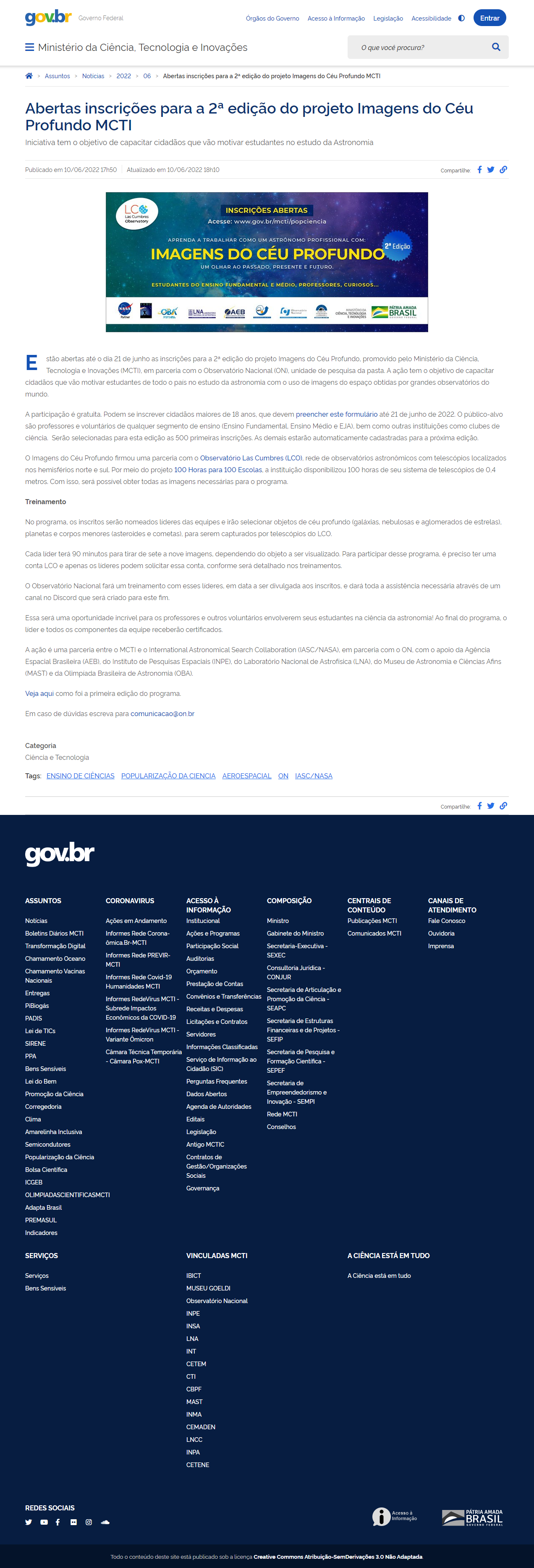Portal MCTI / Boletim Diário - MAST na reportagem "O projeto 'Imagens do Céu Profundo MCTI' está com inscrições abertas