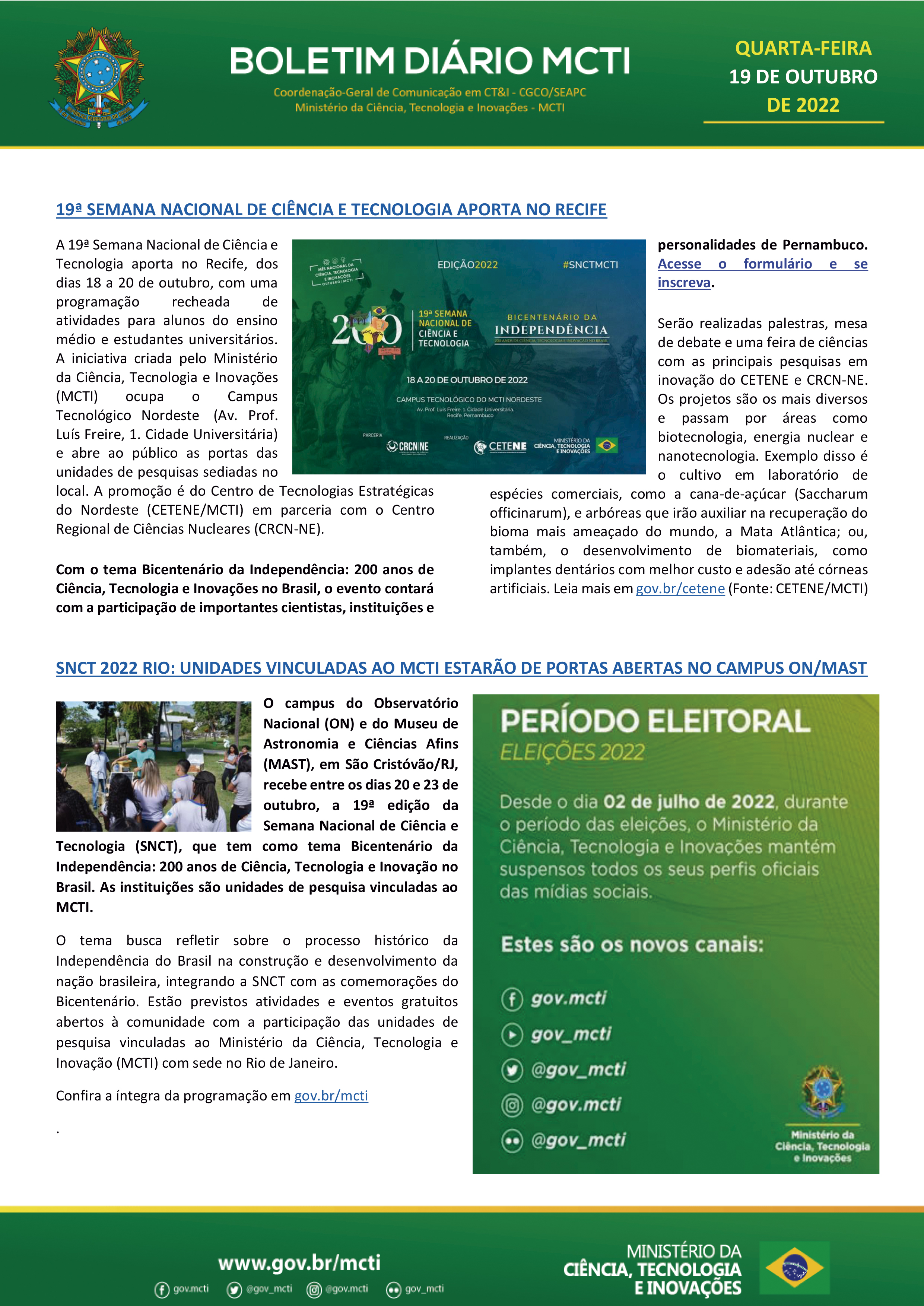 Portal MCTI / Boletim Diário - SNCT 2022 Rio: Unidades Vinculadas ao MCTI estarão de portas abertas no Campus ON/MAST