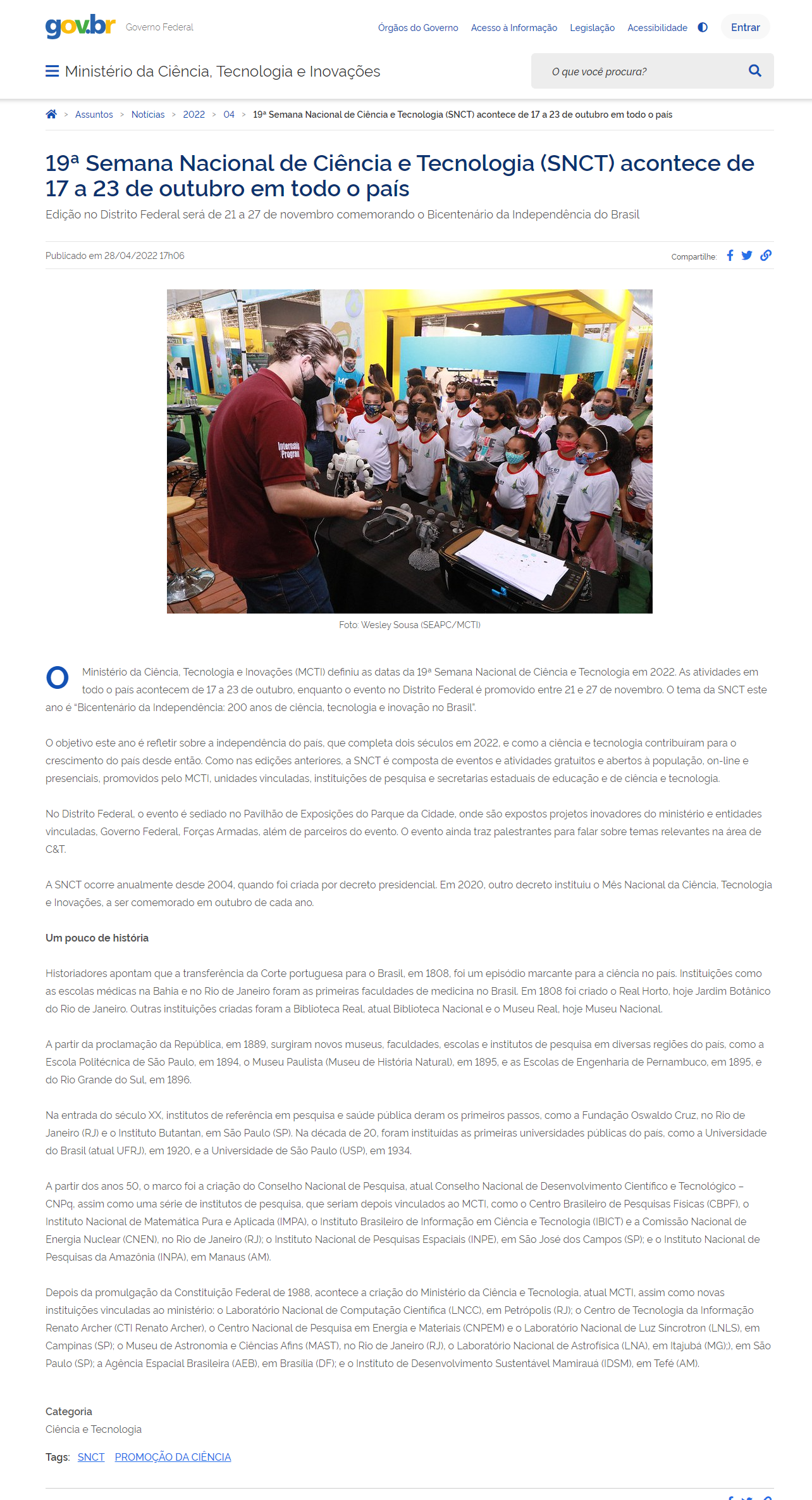Portal MCTI - MAST na reportagem '19ª Semana Nacional de Ciência e Tecnologia (SNCT) acontece de 17 a 23 de outubro em todo o país'