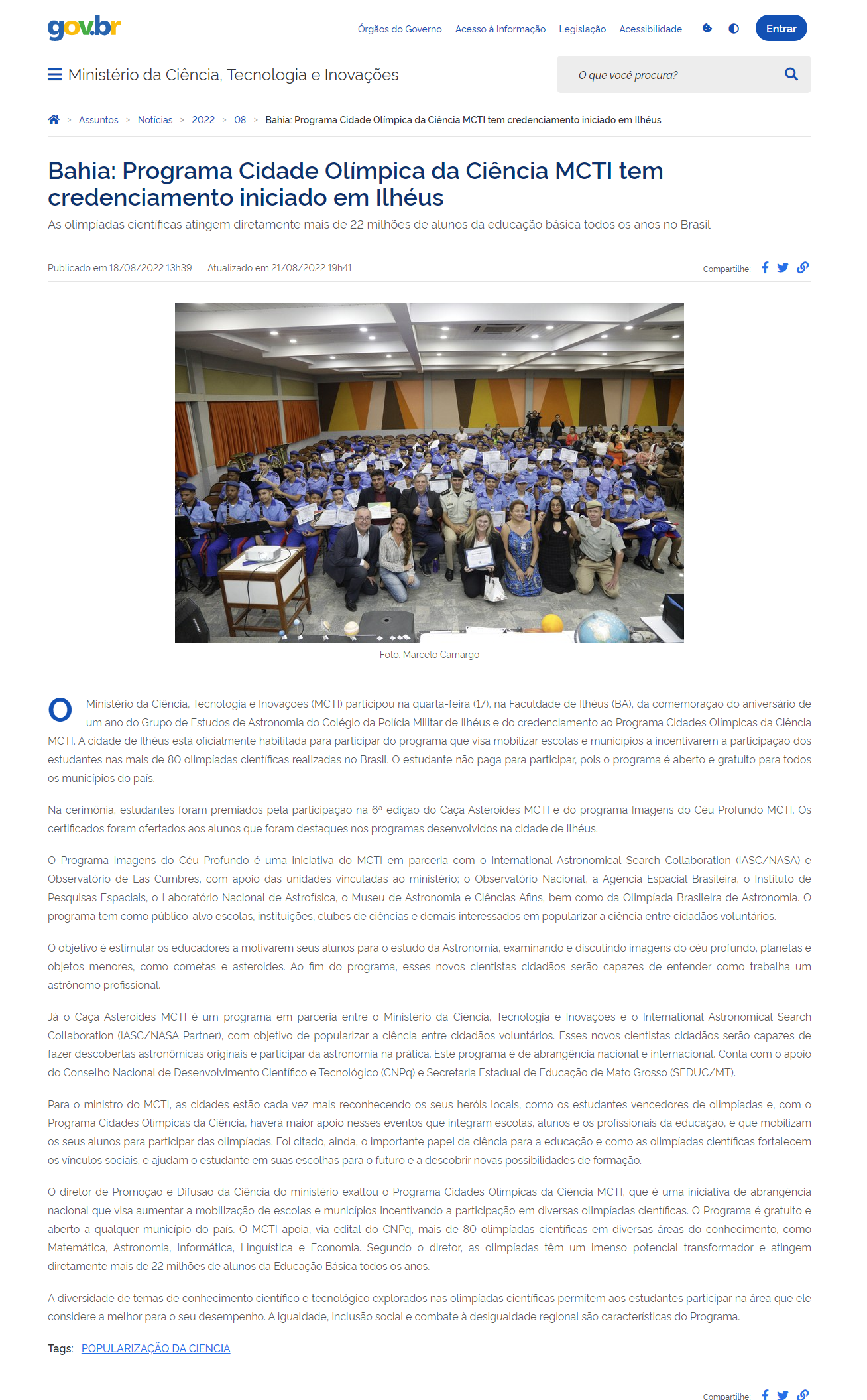 Portal MCTI - MAST na reportagem "Bahia: Programa Cidade Olímpica da Ciência MCTI tem credenciamento iniciado em Ilhéus"