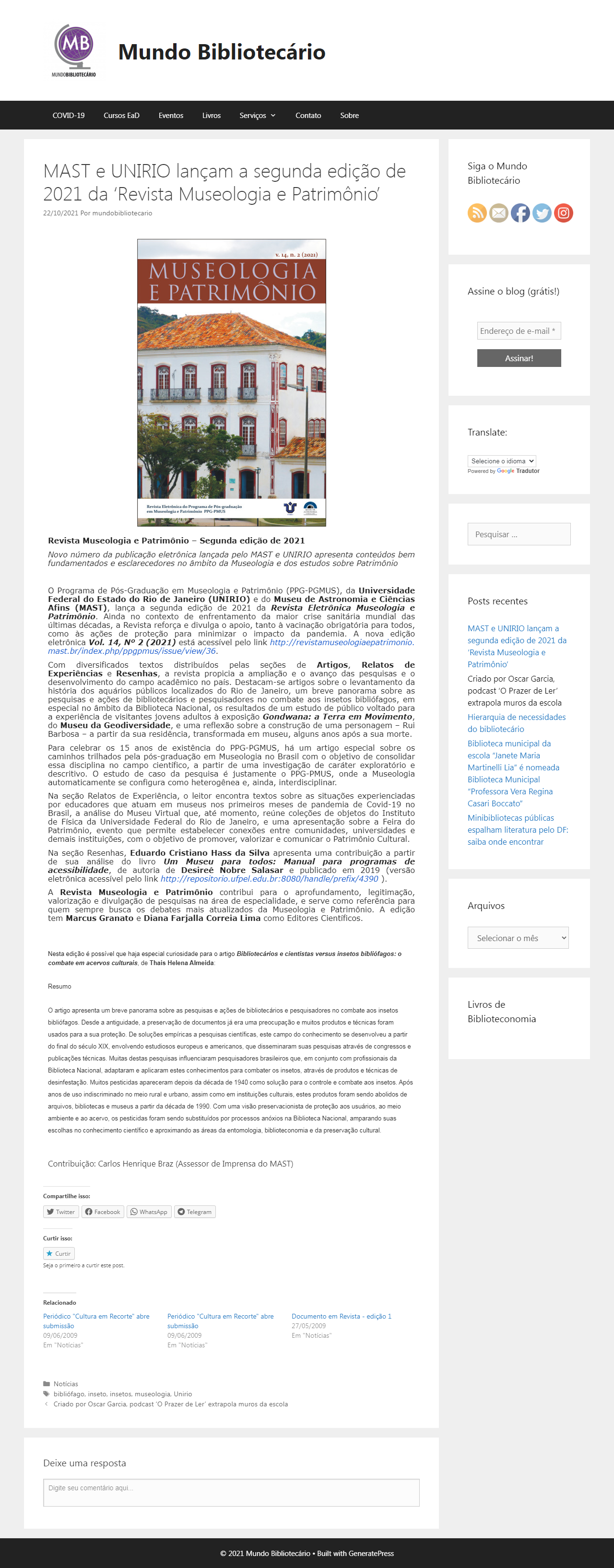 Portal Mundo Bibliotecário - MAST e UNIRIO lançam a segunda edição de 2021 da 'Revista Museologia e Patrimônio'