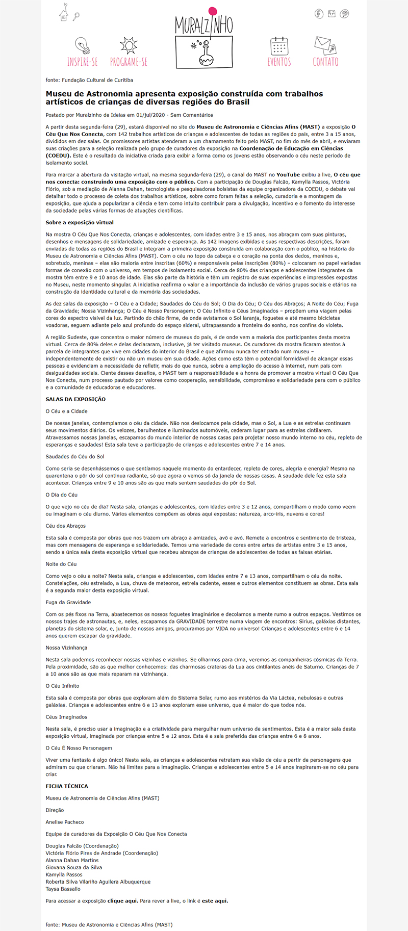 Portal Muralzinho de Ideias (Curitiba – PR) | MAST inaugura a mostra virtual 'O Céu Que Nos Conecta'