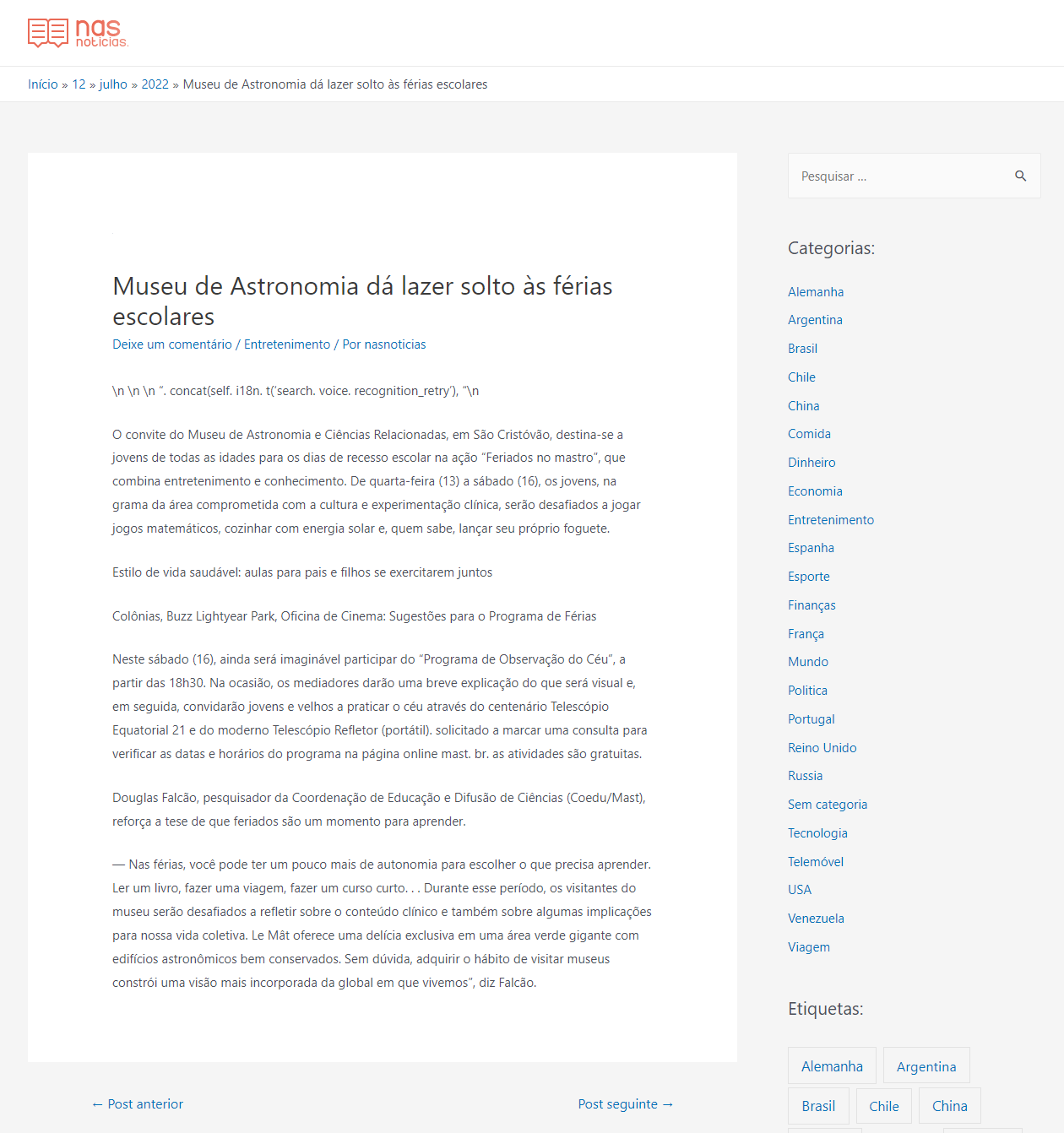 Portal Nas Notícias (Lisboa-PT) - Museu de Astronomia dá lazer solto às férias escolares