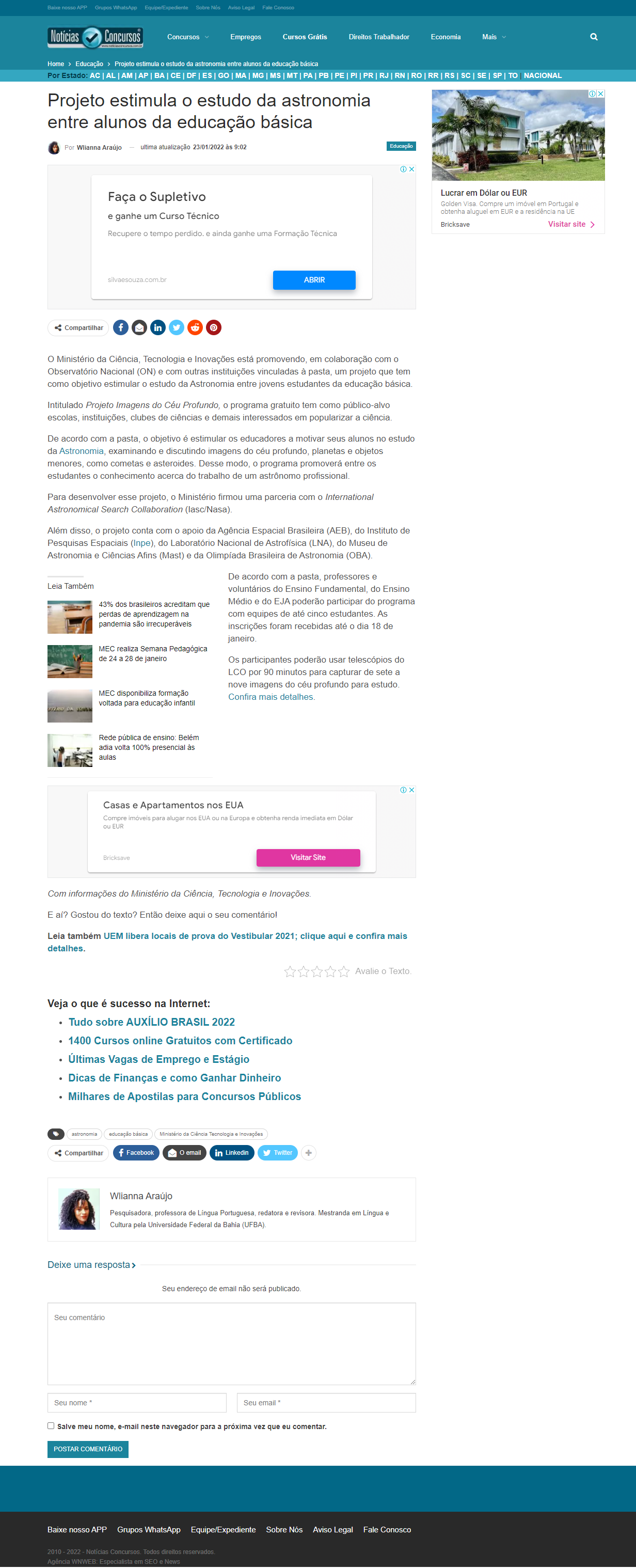 Portal Notícias Concursos - MAST na reportagem 'Projeto estimula o estudo da astronomia entre alunos da educação básica'