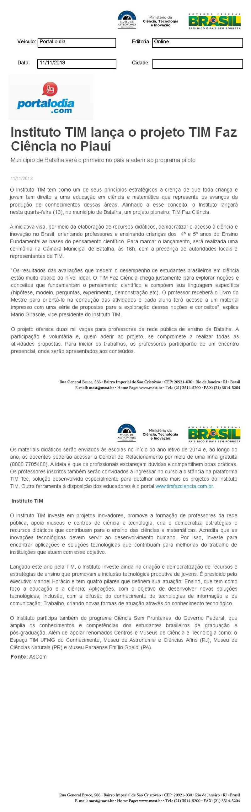 Portal odia.com | Instituto TIM lança o projeto TIM Faz Ciência no Piauí