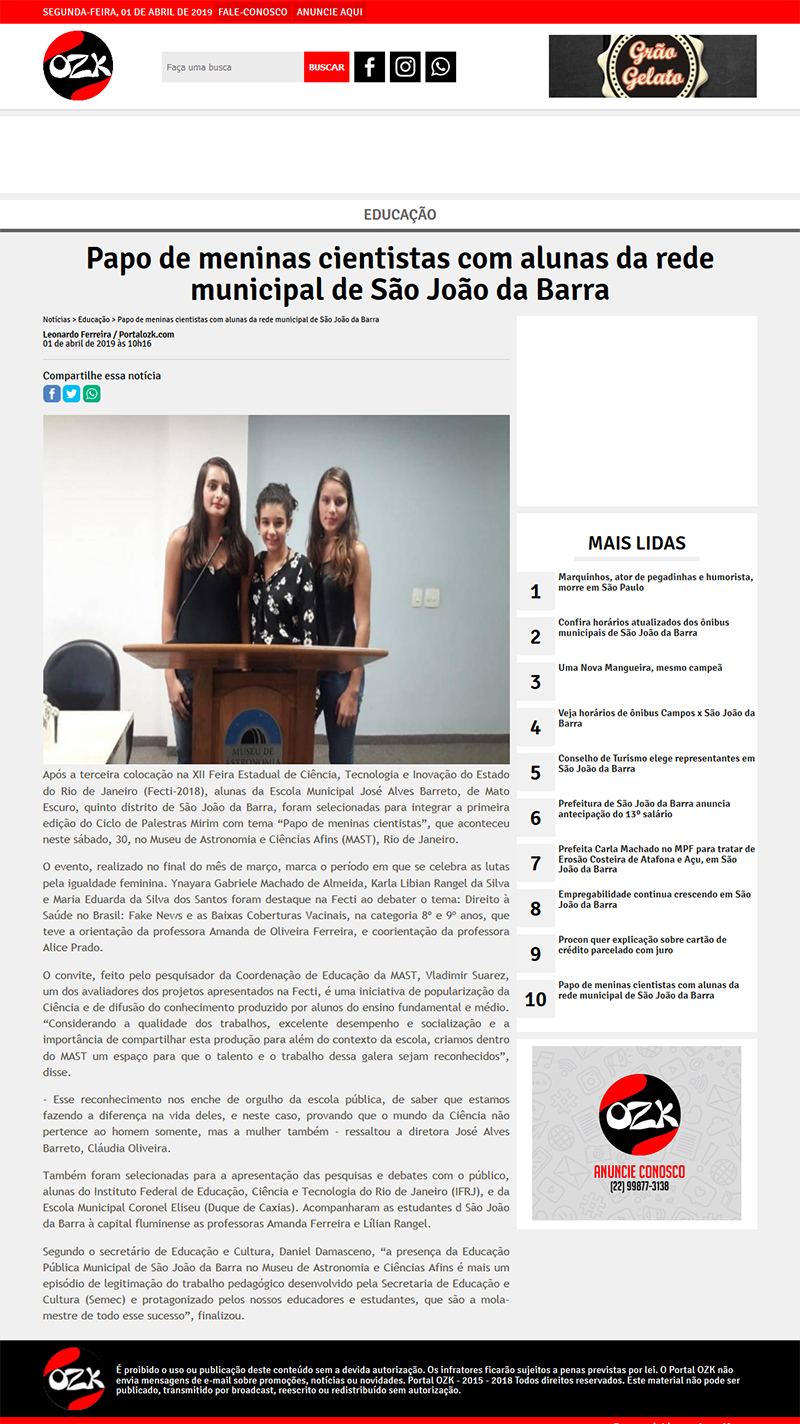 Portal OZK | Papo de meninas cientistas com alunas da rede municipal de São João da Barra
