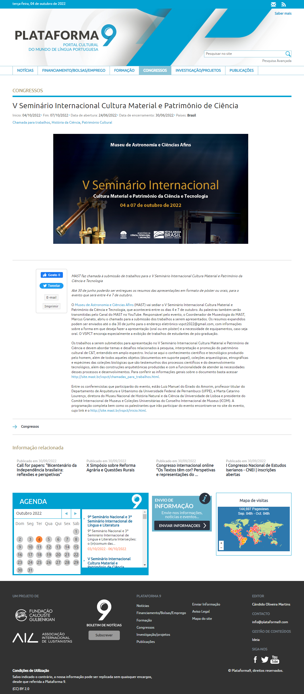 Portal Plataforma 9 (Lisboa) - MAST realiza o V Seminário Internacional Cultura Material e Patrimônio da Ciência e Tecnologia