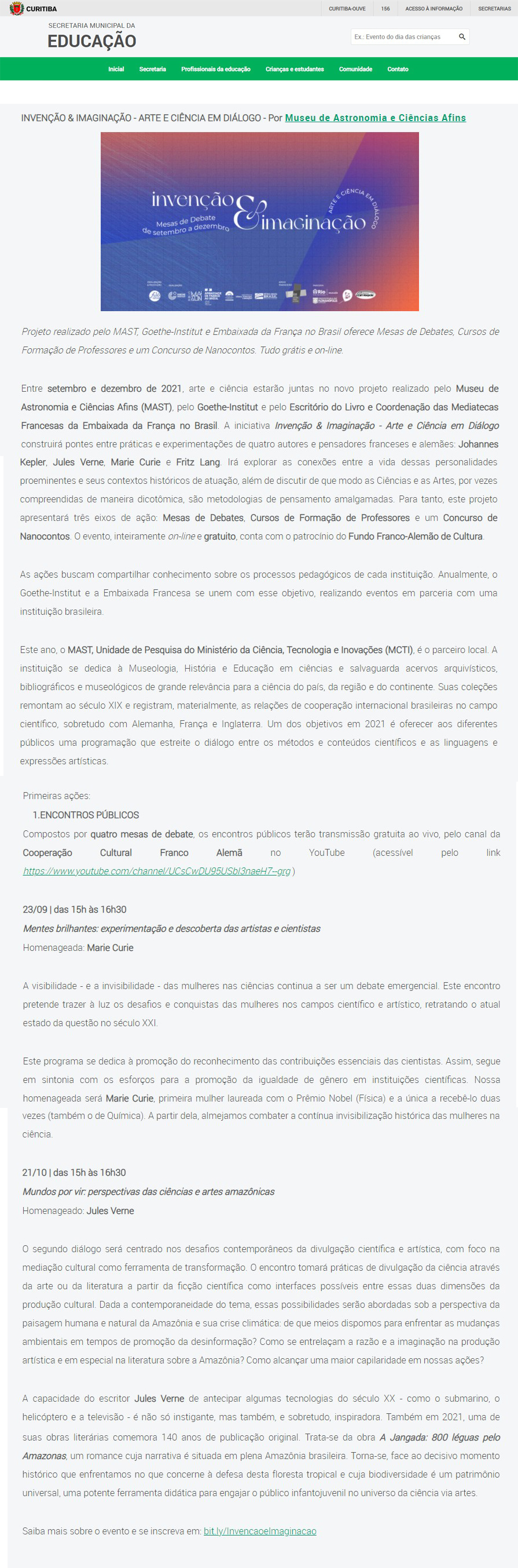 Portal Secretaria de Educação Curitiba - MAST, Goethe-Institut e Embaixada da França realizam o projeto 'Invenção & Imaginação'