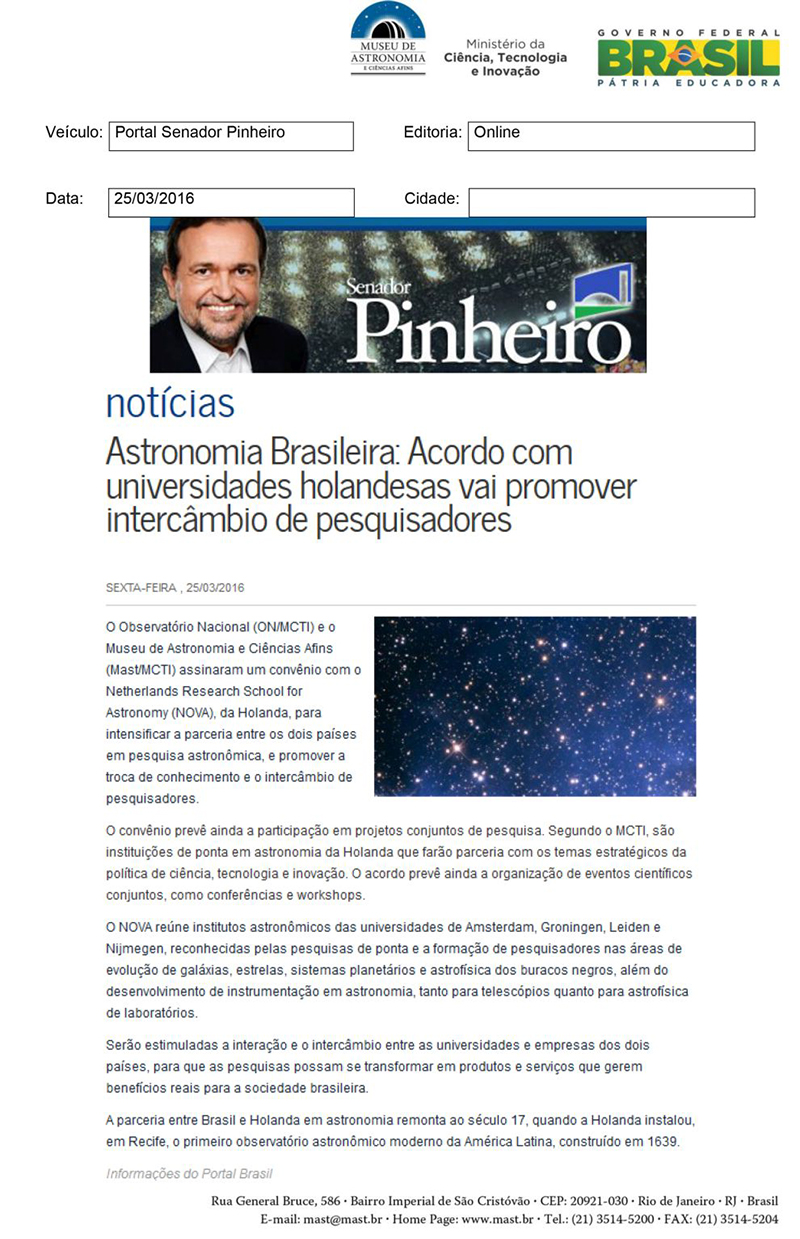 Portal Senador Pinheiro | Astronomia Brasileira: Acordo com universidades holandesas vai promover intercâmbio de pesquisadores