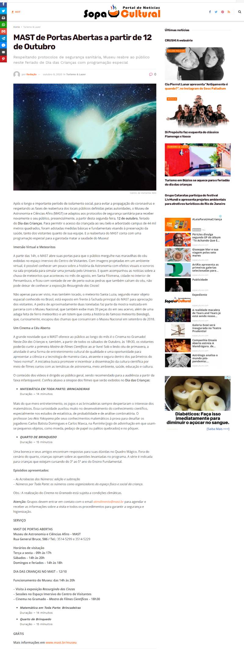 Portal Sopa Cultural | Museu de Astronomia e Ciências reabre com programação para o Dia das Crianças
