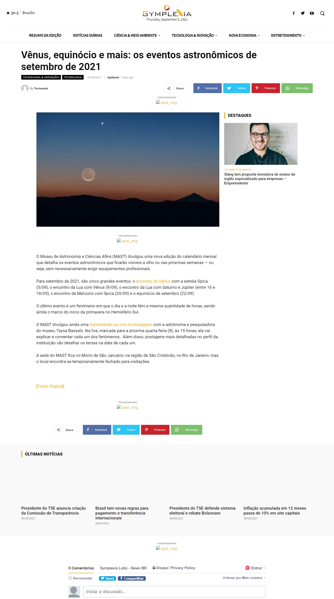 Portal Symplexia (Brasília-DF) - MAST na reportagem 'Vênus, equinócio e mais: os eventos astronômicos de setembro de 2021'
