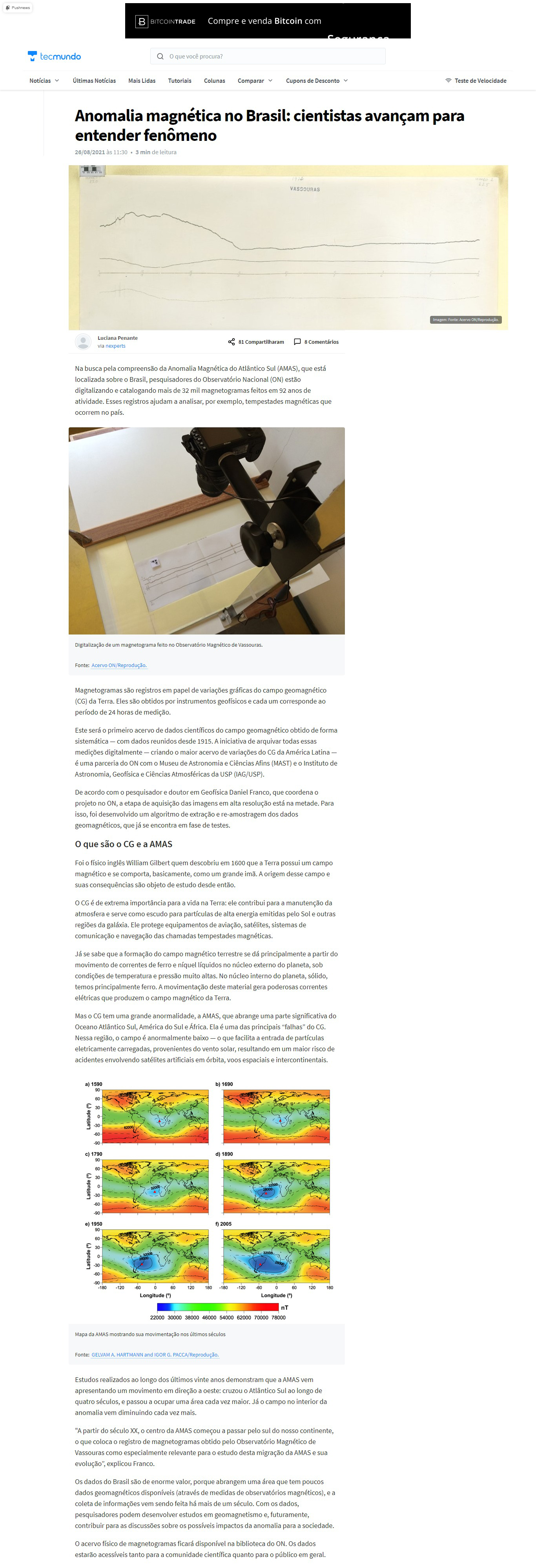 Portal Techmundo - MAST na reportagem 'Anomalia magnética no Brasil: cientistas avançam para entender fenômeno'
