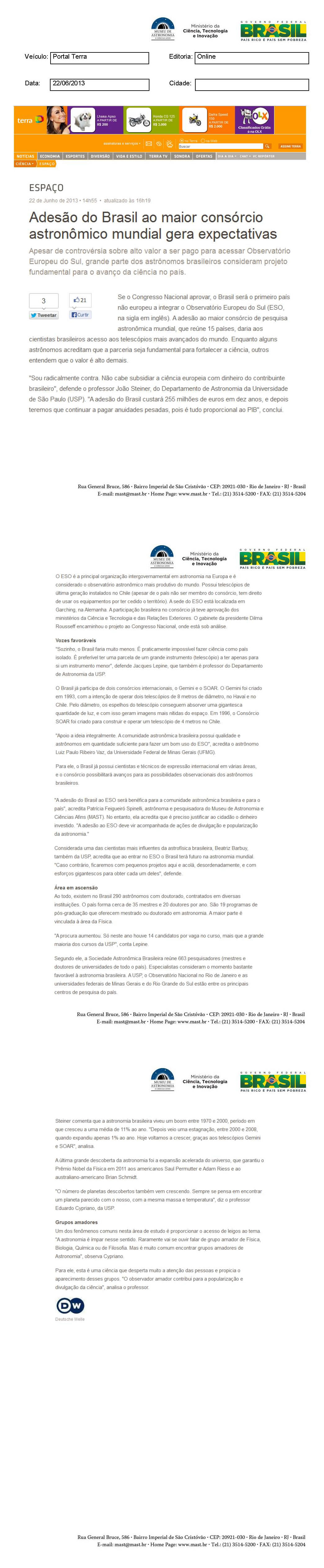 Portal Terra | Adesão do Brasil ao maior consórcio astronômico mundial gera expectativas