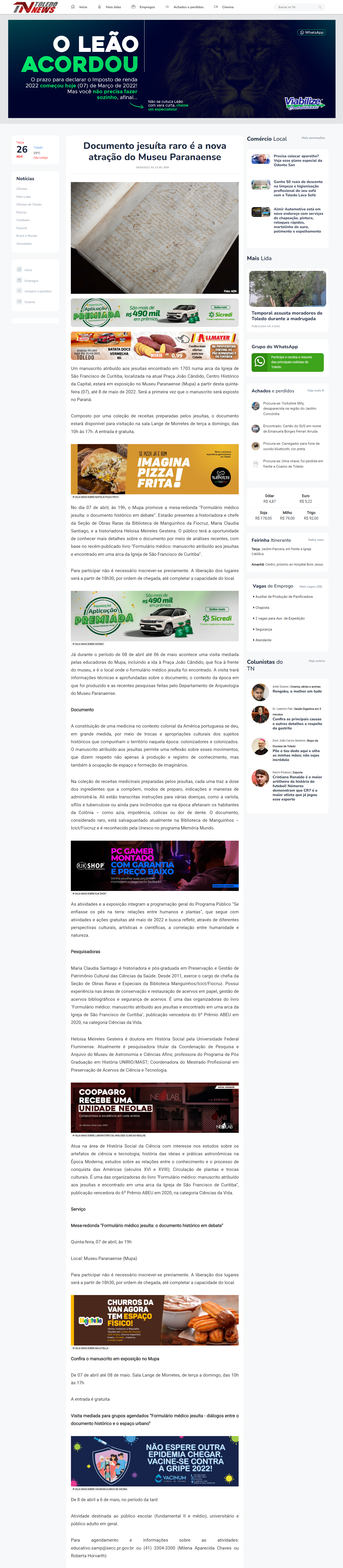 Portal Toledo News (Toledo-PR) - Historiadora do MAST participa de mesa-redonda sobre raro documento jesuíta no Museu Paranaense (MUPA)