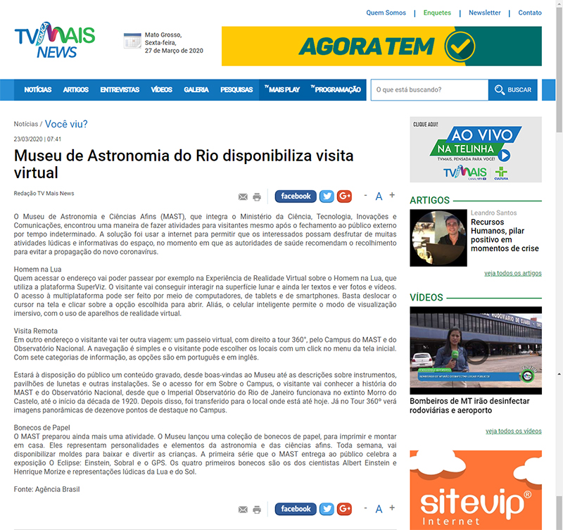 Portal TV Mais News (Cuiabá – MT) | MAST disponibiliza visita virtual