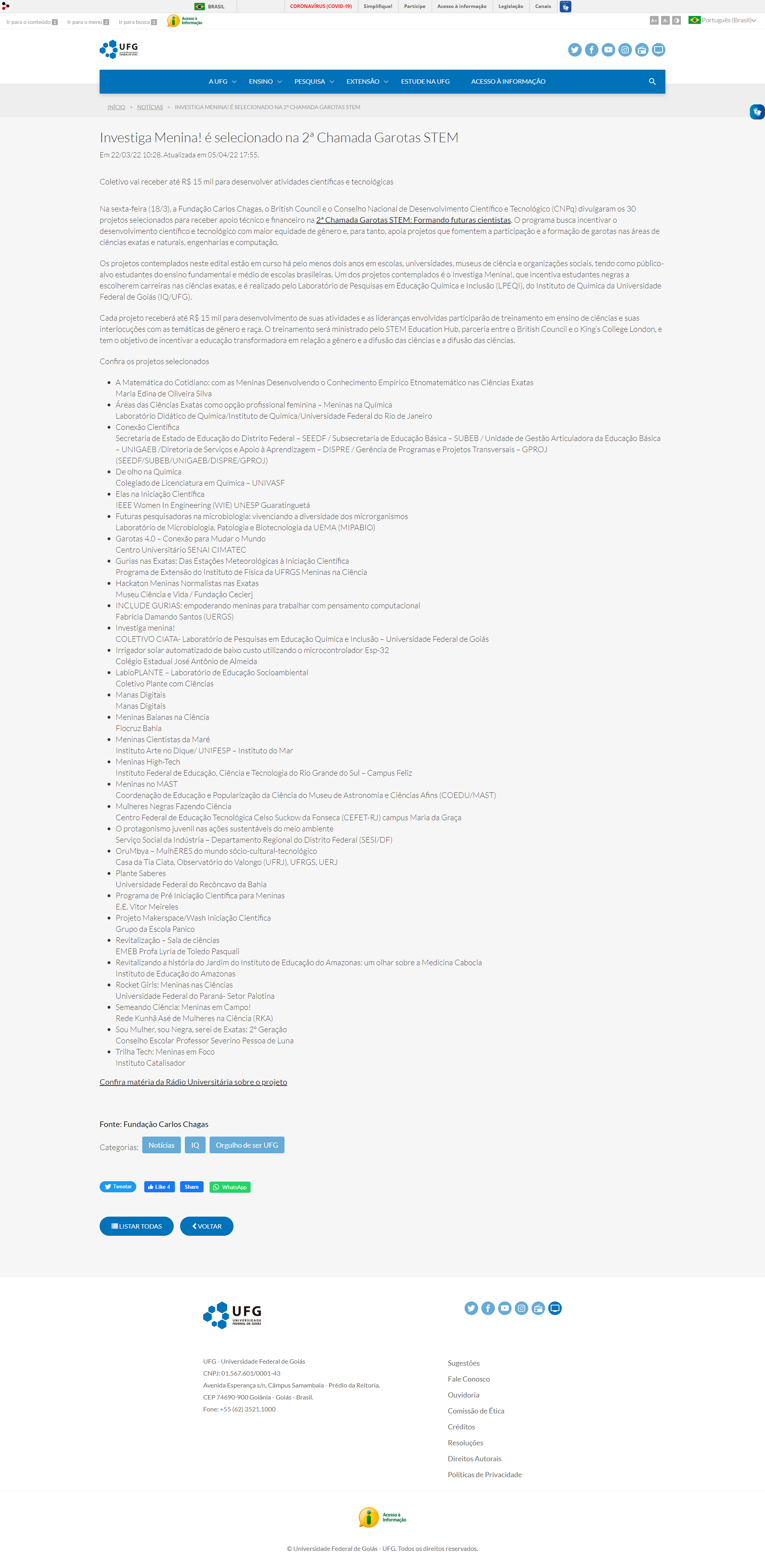 Portal UFG (Universidade Federal de Goiás) - Projeto 'Meninas no MAST' na reportagem '2ª Chamada Garotas STEM'