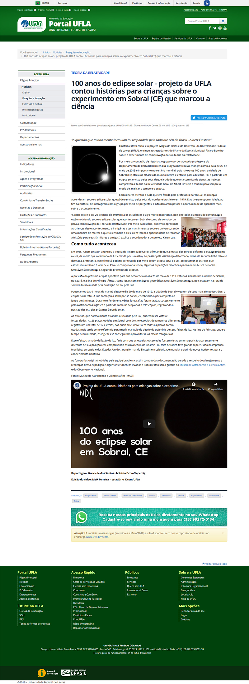 Portal UFLA | 100 anos do eclipse solar - projeto da UFLA contou histórias para crianças sobre o experimento em Sobral (CE) que marcou a ciência