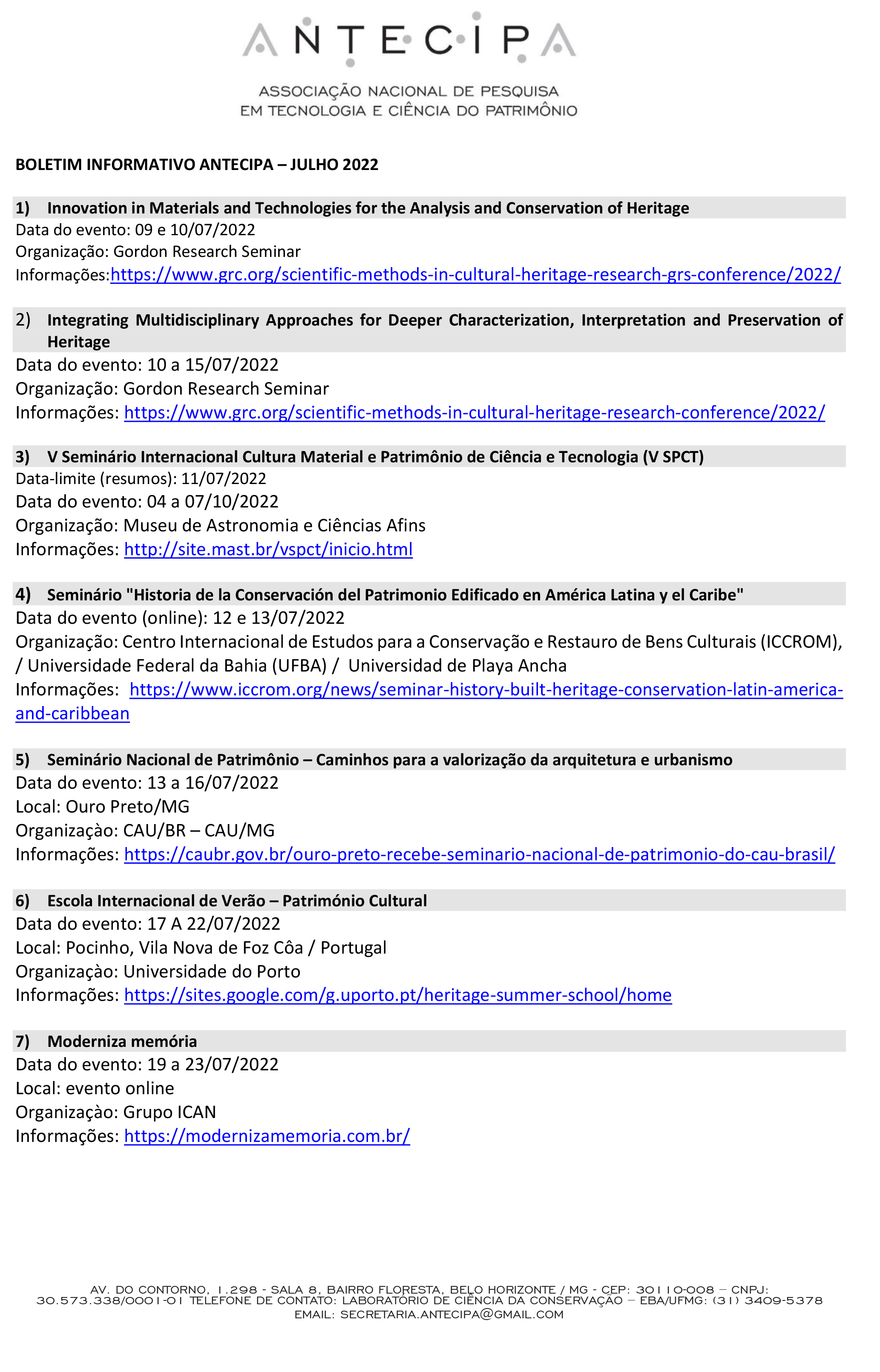 Portal UFMG Boletim ANTECIPA (Belo Horizonte-MG) – V Seminário Internacional Cultura Material e Patrimônio de Ciência e Tecnologia (V SPCT)