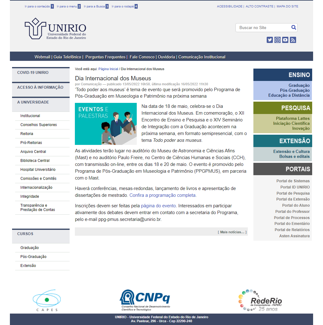 Portal UNIRIO - MAST na reportagem "Dia Internacional de Museus"