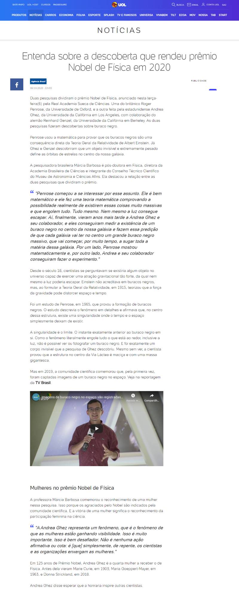 Portal UOL | MAST na reportagem "Entenda sobre a descoberta que rendeu prêmio Nobel de Física em 2020"