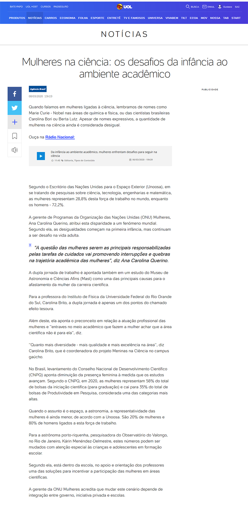 Portal UOL - Notícias | Mulheres na ciência: os desafios da infância ao meio acadêmico