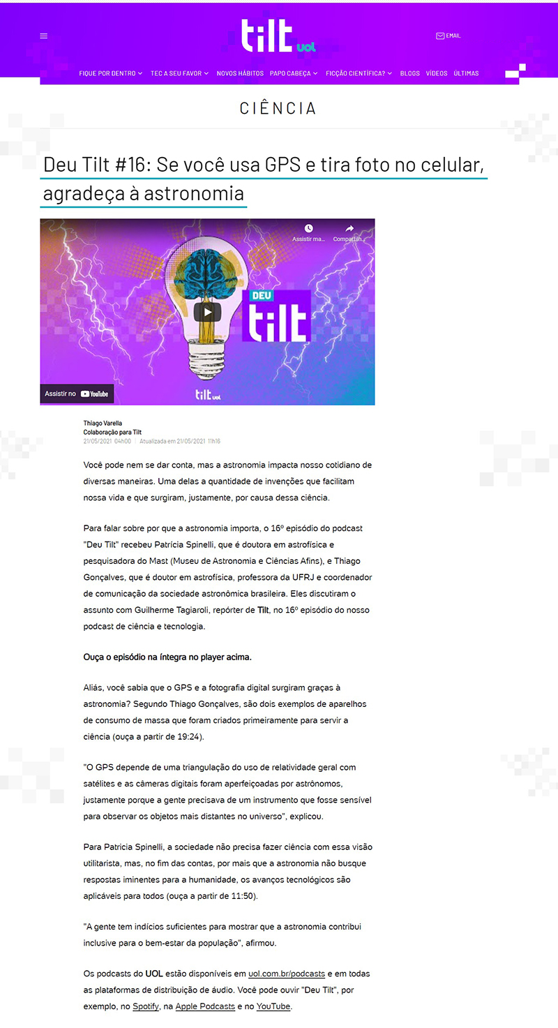 Portal UOL / Podcast 'Deu Tilt' | A pesquisadora e astrofísica do MAST Patrícia Spinelli é entrevistada no episódio 16: "Se você usa GPS e tira foto no celular, agradeça à astronomia"