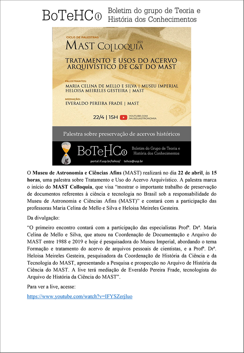 Portal USP / Boletim BoTeHCo (Grupo de Teoria e História dos Conhecimentos) | MAST Colloquia: Tratamento e Uso do Acervo Arquivístico