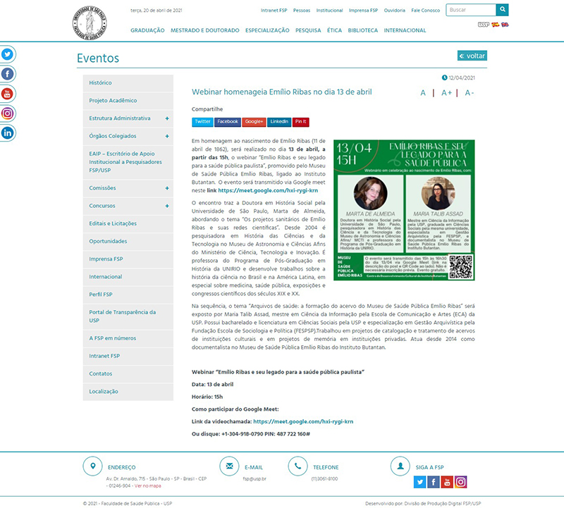 Portal USP / Faculdade de Saúde Pública | MAST participa de Webinar em homenagem a Emílio Ribas em 13 de abril