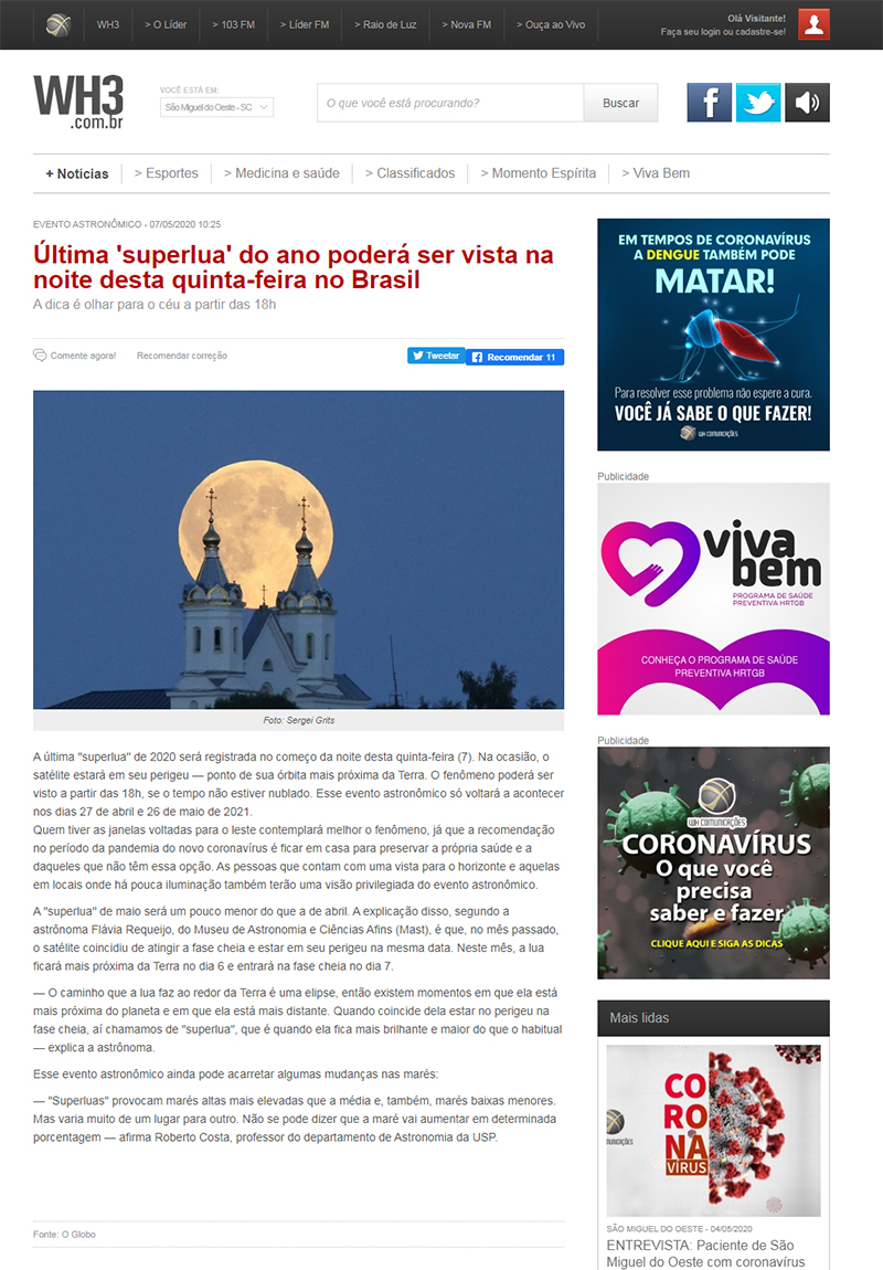 Portal WH3 Notícias (São Miguel do Oeste - SC) | MAST na reportagem sobre a última Superlua de 2020