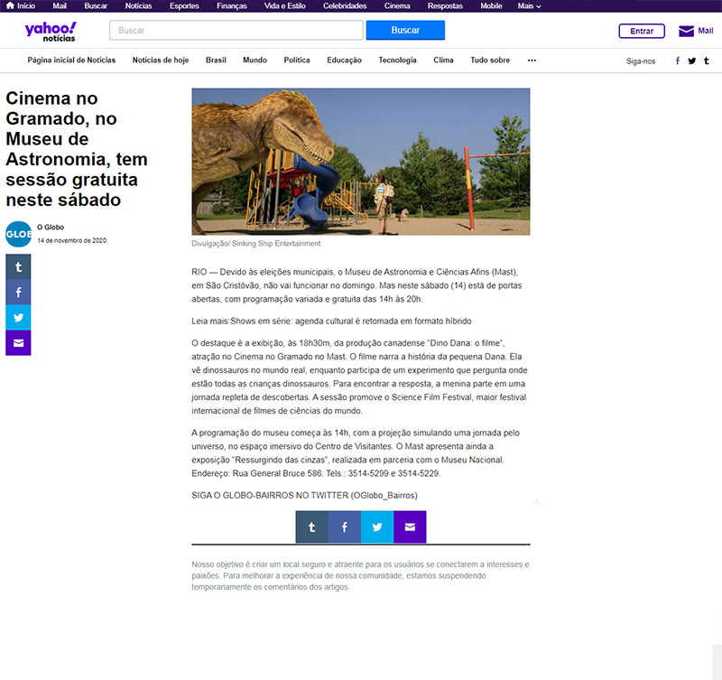 Portal Yahoo / Notícias | Sábado com Science Film Festival no gramado