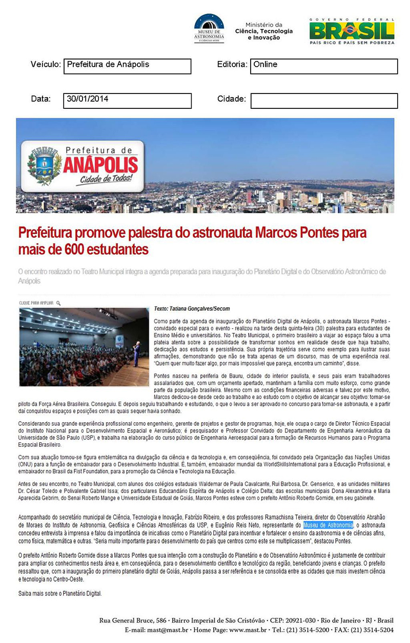 Prefeitura de Anápolis | Prefeitura promove palestra do astronouta Marcos Pontes para mais de 600 estudantes