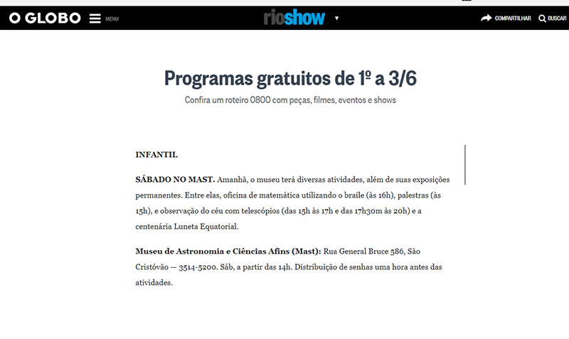 O Globo - Rio Show | Programas gratuitos de 1° a 3 de junho