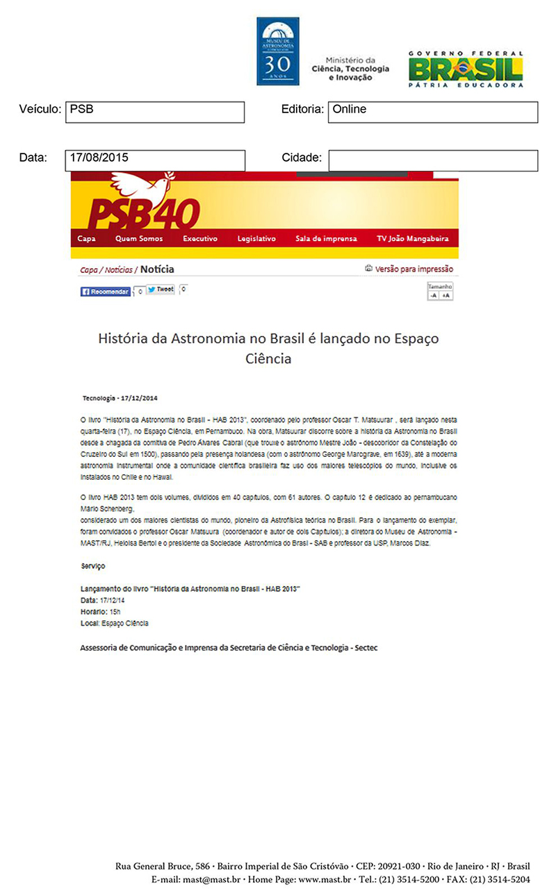 PSB | História da Astronomia no Brasil é lançado no Espaço Ciência