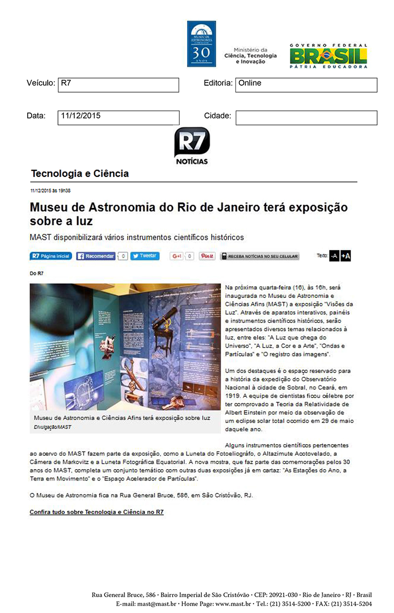 R7 | Museu de Astronomia do Rio de Janeiro terá exposição sobre a luz