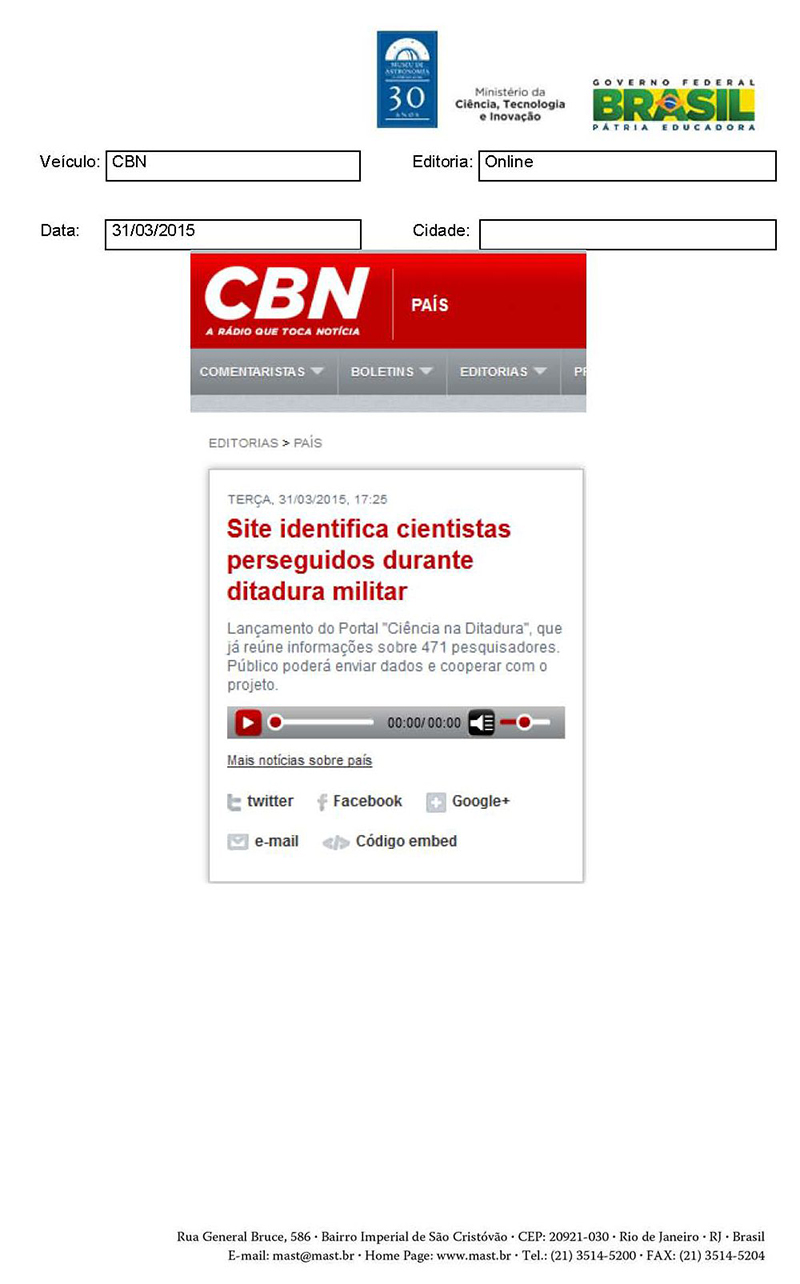 Rádio CBN | Site identifica cientistas perseguidos durante regime militar