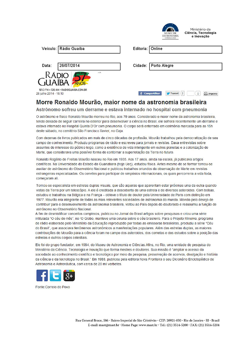 Rádio Guaíba | Morre Ronaldo Mourão, maior nome da astronomia brasileira