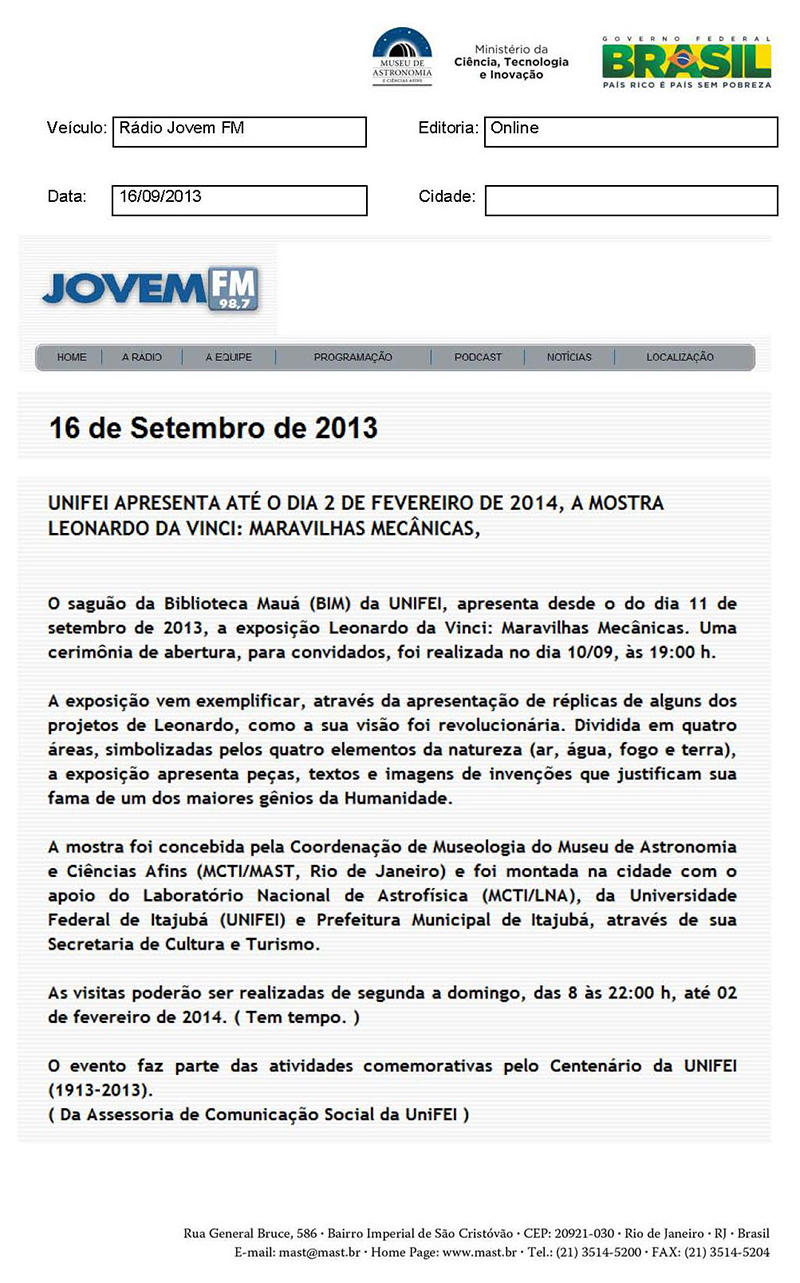 Rádio Jovem FM | UNIFEI apresenta até o dia 2 de fevereiro de 2014, a mostra Leonardo Da Vinci: Maravilhas Mecânicas