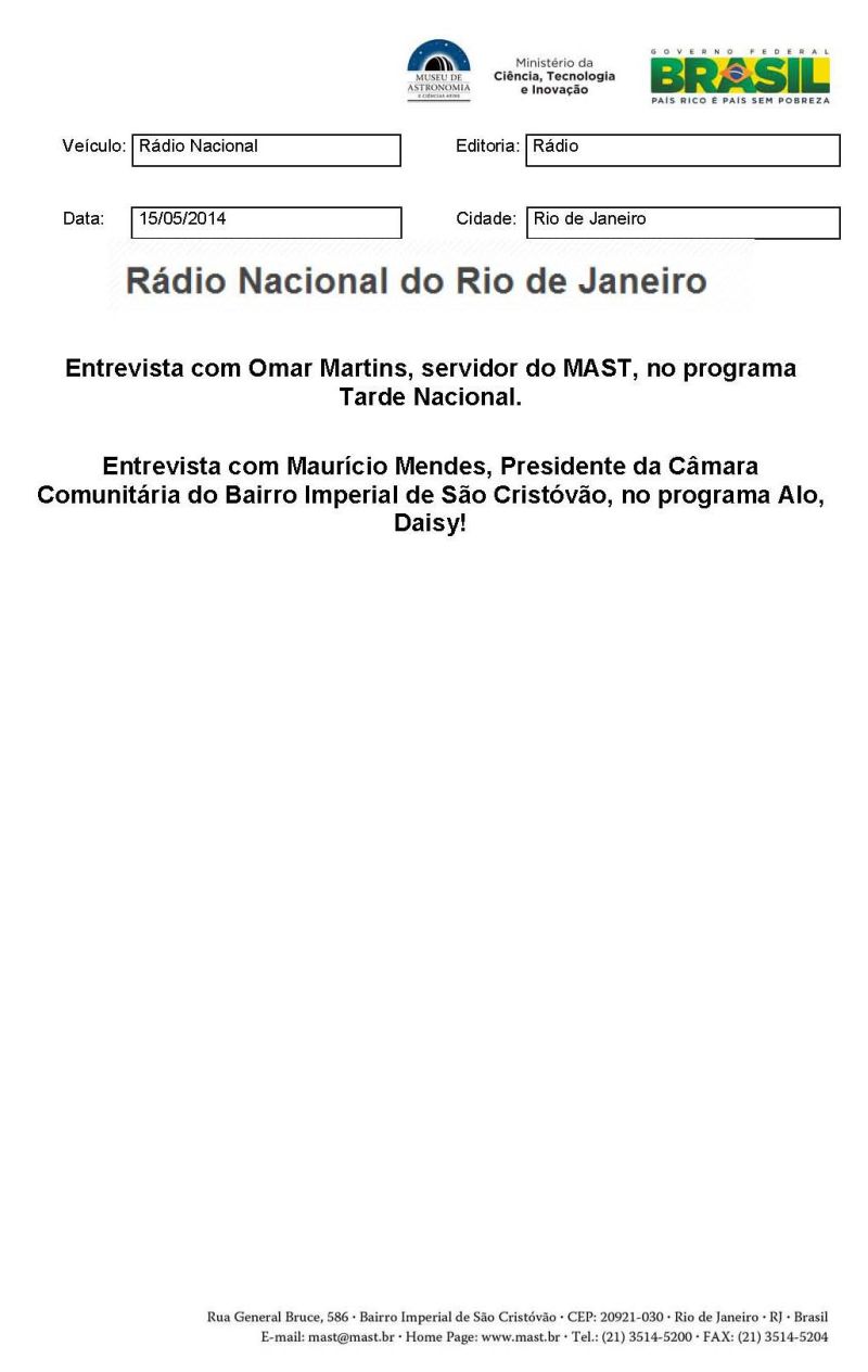 Rádio Nacional do Rio de Janeiro | Entrevista com Omar Martins , servidor do MAST, no programa Tarde Nacional