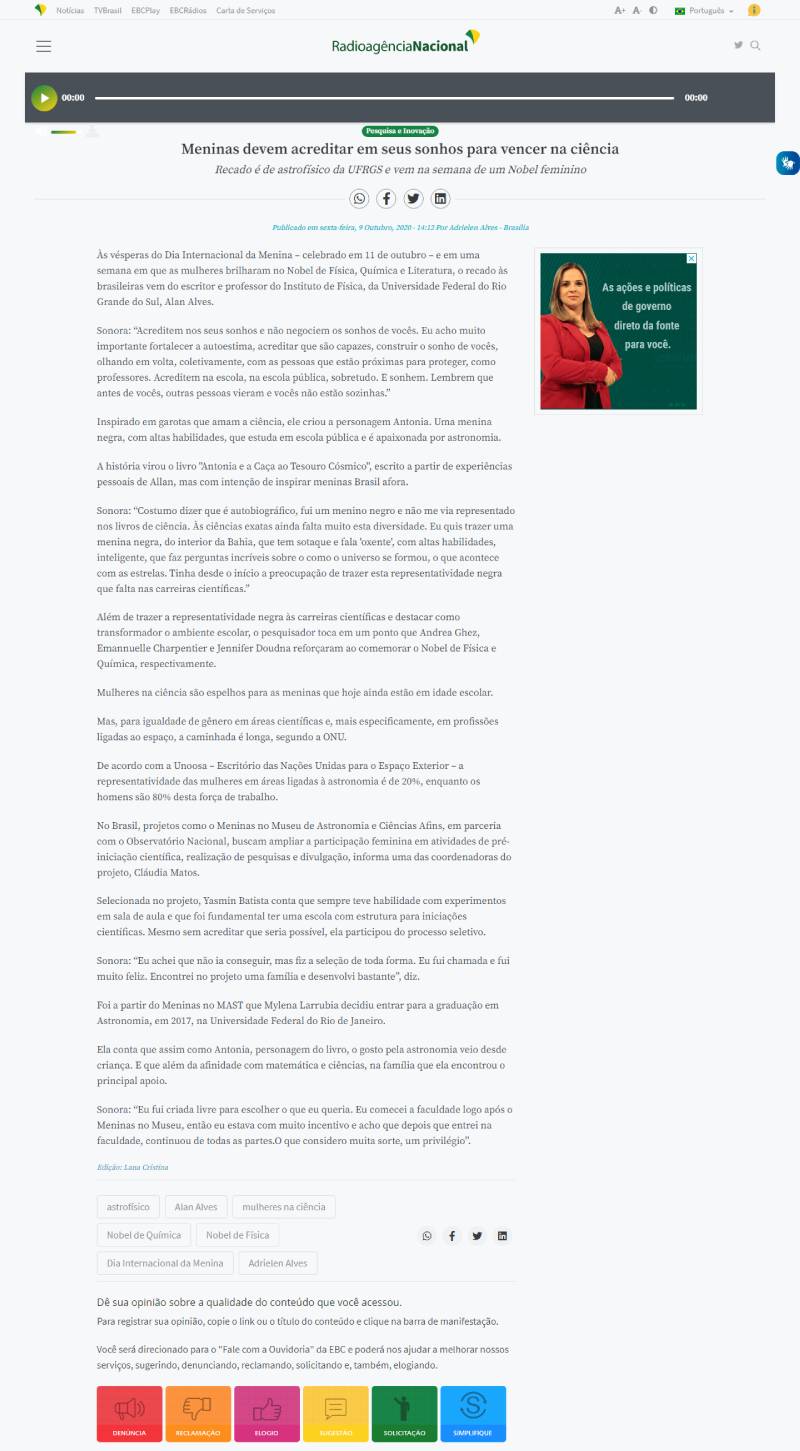 Radioagência Nacional / EBC | MAST na reportagem "Meninas devem acreditar em seus sonhos para vencer na ciência"