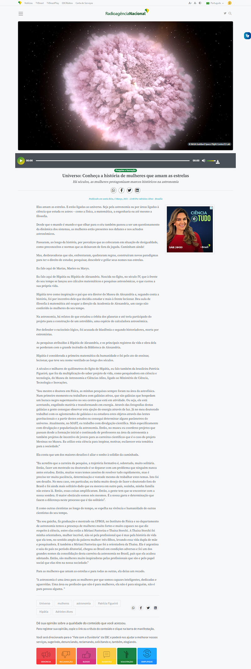 Radioagência Nacional / EBC / Podcast Universo | MAST na reportagem 'Conheça histórias de mulheres que, pelos séculos, estudam os astros'