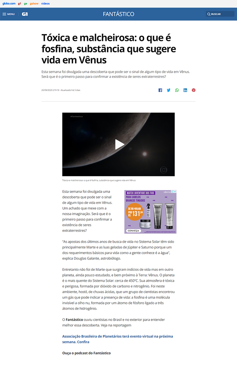 Rede Globo - 'Fantástico' | MAST dá apoio à realização da reportagem sobre a possibilidade de vida em Vênus | "Tóxica e malcheirosa: o que é a fosfina, substância que sugere vida em Vênus