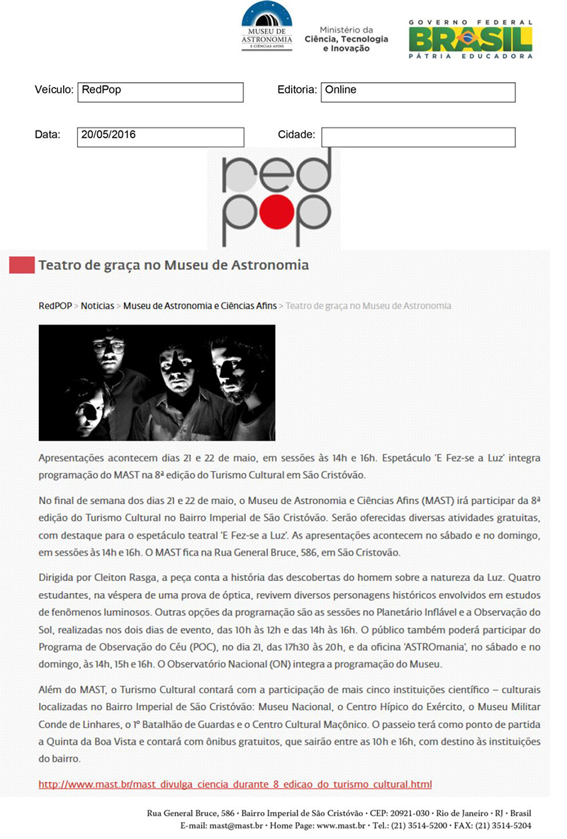 Redpop | Teatro de graça no Museu de Astronomia