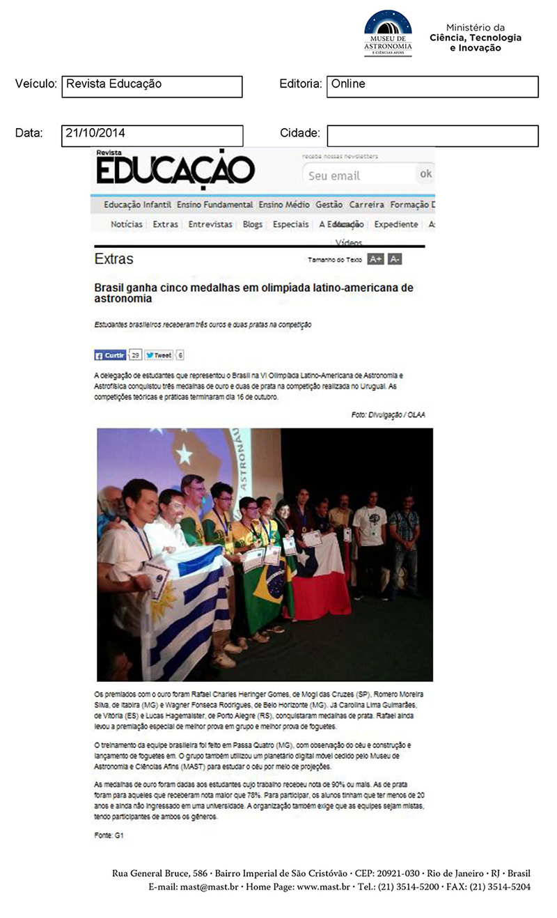 Revista Educação | Brasil ganha cinco medalhas em olimpíada latino-americana de astronomia