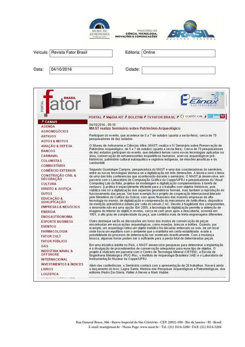Revista Fator Brasil | MAST realiza Seminário sobre Patrimônio Arqueológico